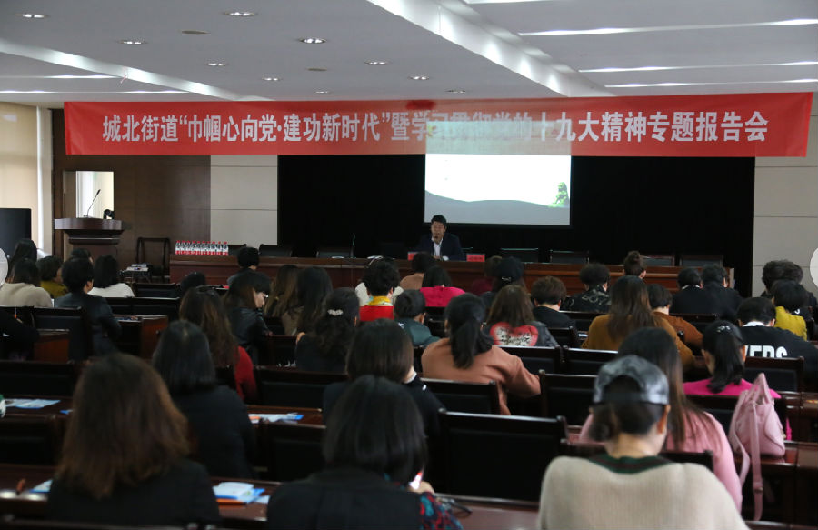 2017年11月17日,城北街道六楼会议室座无虚席,由街道妇联组织开展的“巾帼心向党·建功新时代”暨学习贯彻党的十九大精神专题报告会吸引了辖区17个村居的妇联执委、部分妇女代表200余人参加。大家认真听取了街道宣统委员对十九大精神的宣讲,之后的十九大知识竞赛中,姐妹们踊跃参与,“十九大的主题是什么”、“提出的社会主要矛盾是什么”、“四个新”、“扶贫数据”等等问题都难不倒认真听课的妇女干部们。课程完毕大家还意犹未尽,纷纷在微信群里抒发感想,展开了新一轮的讨论。对于她们来说,十九大精神并不遥远,报告中提到的幼有所育、学有所教、劳有所得、病有所医、老有所养、住有所居、弱有所扶都与生活息息相关,也是她们最为关心的话题。她们表示,要用十九大精神来加宽肩膀上的担子,在自己的岗位上为决胜全面建成小康社会贡献自己的一份力量。