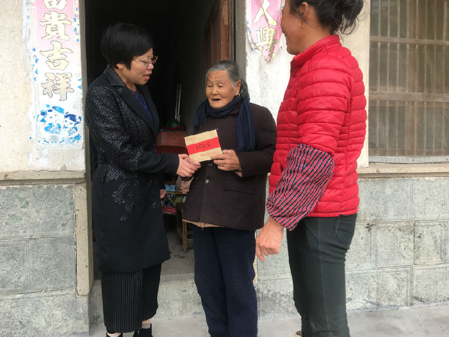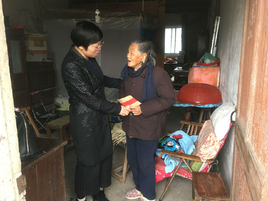 俞领妹已79岁,她的丈夫早已去世,家庭年收入只有4610元。她3个儿子都未婚,其中1个儿子因生病无劳动能力长年瘫于床上,并申请了低保。在俞领妹家中,厉决奋主席与她亲切交流,仔细询问她的生活情况和身体状况,鼓励她要树立生活的信心,以坚强、乐观的态度面对生活中的不幸,并给她送去了慰问金。俞领妹倍感感动,并表示在妇联的关心下,有信心把日子过得越来越好。