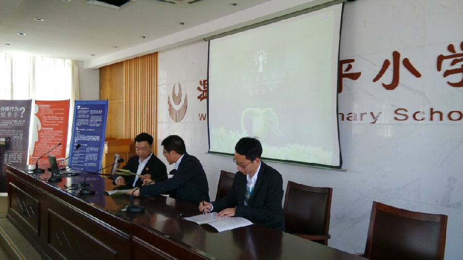 4月1日,“心芽”儿童保护项目在太平小学举行启动仪式,温岭市人民检察院金臻玉副检察长和温岭市太平街道金力副书记到场参加。仪式共有项目介绍、项目书签订、志愿者聘书发放、志愿队代表发言、简易心理互动和专题培训等议程。首场培训主题为《拒绝伤害,共同关爱》,由检察院宣讲团成员主讲,内容为侵害儿童行为的类型、容易遭受侵害的时间及场所、如何自我保护等等,参加学生共200余人,发放宣传资料300余份。